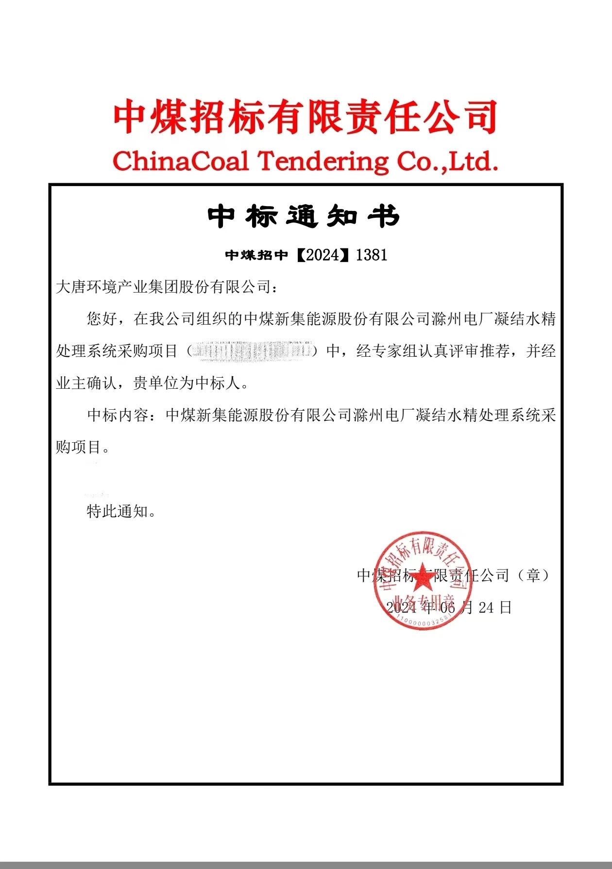 本网讯 近日,水务公司成功中标中煤滁州电厂凝结水精处理项目。