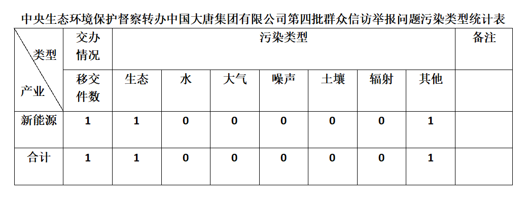 2025年6月6日,中央第七生态环境保护督察组向中国大唐集团有限公司移交第四批群众信访举报件,共计1件,为来信举报,涉及生态问题1个、其他问题1个。所有举报件办理工作已第一时间进入调查核实办理程序,办理情况将按照相关要求反馈督察组,并及时向社会公开。