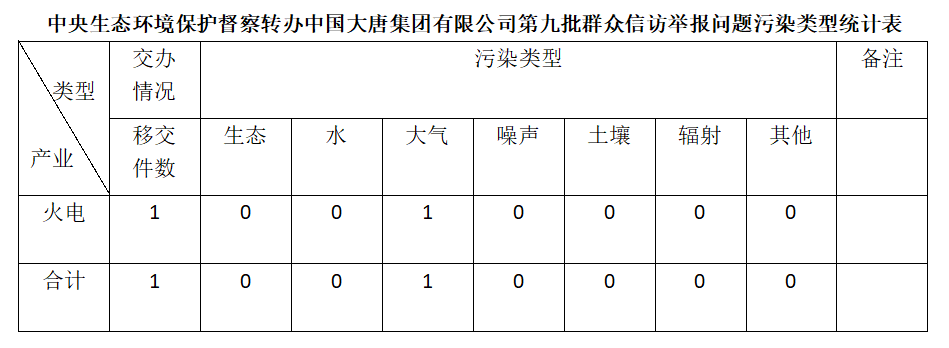 2025年6月12日,中央第七生态环境保护督察组向中国大唐集团有限公司移交第九批群众信访举报件,共计1件,为来电举报,涉及大气问题1个。所有举报件办理工作已第一时间进入调查核实办理程序,办理情况将按照相关要求反馈督察组,并及时向社会公开。
