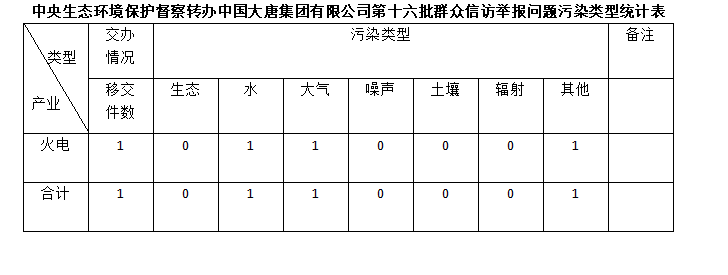 2025年6月22日,中央第七生态环境保护督察组向中国大唐集团有限公司移交第十六批群众信访举报件,共计1件,为来电举报1件,涉及水问题1个、大气问题1个、其他问题1个。所有举报件办理工作已第一时间进入调查核实办理程序,办理情况将按照相关要求反馈督察组,并及时向社会公开。