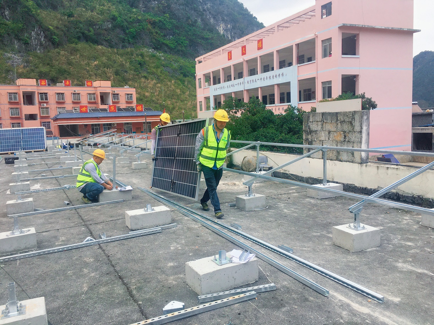 2月18日,在板兰村村委前的广场上,几辆运输车到来的马达声划破了清晨的宁静,车上层层叠叠的金属框架和光伏板整齐地排列着。桂冠电力公司的职工们沐浴着南国春光,热火朝天地开始了崭新的“光伏”振兴工作……